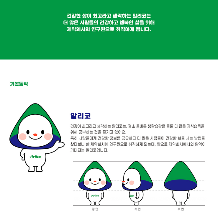 A. 알리코제약의 창업이념과 기업이념에 맞는 이미지를 형상화한 캐릭터를 개발하여,