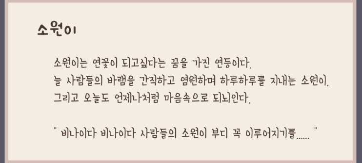 소원이는 연꽃이 되고싶다는 꿈을 가진 연등이다.