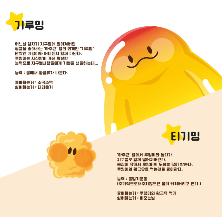 기름과 튀김을 모티브로 하였고, 젤리같고 동글동글한 형상의 외계인으로 표현하여