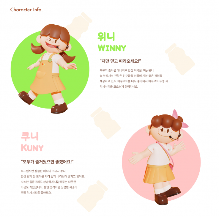 - 견학로에 방문하거나 위니/쿠니와 소통하는 어린이들에게 호감가는 형태 및 컬러