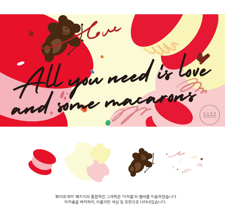문구에 맞추어, 전반적인 그래픽은 마카롱으로, 마카롱의 강렬한 레드를 중심으로,