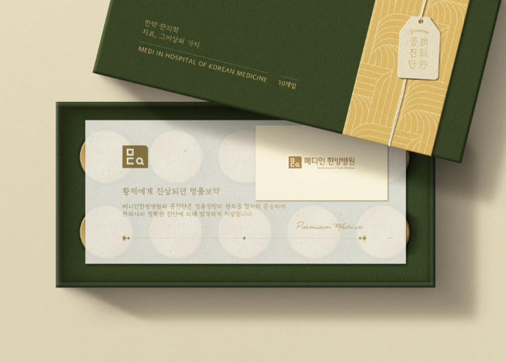 원내에서 직접 조제하는 프리미엄 공진단 이미지를 담아낸 브랜딩과 패키지 디자인이 필요합니다.