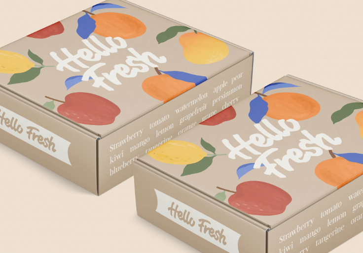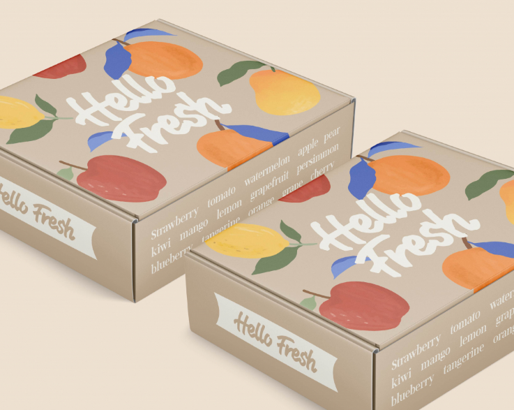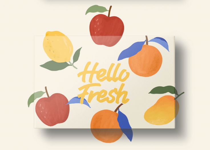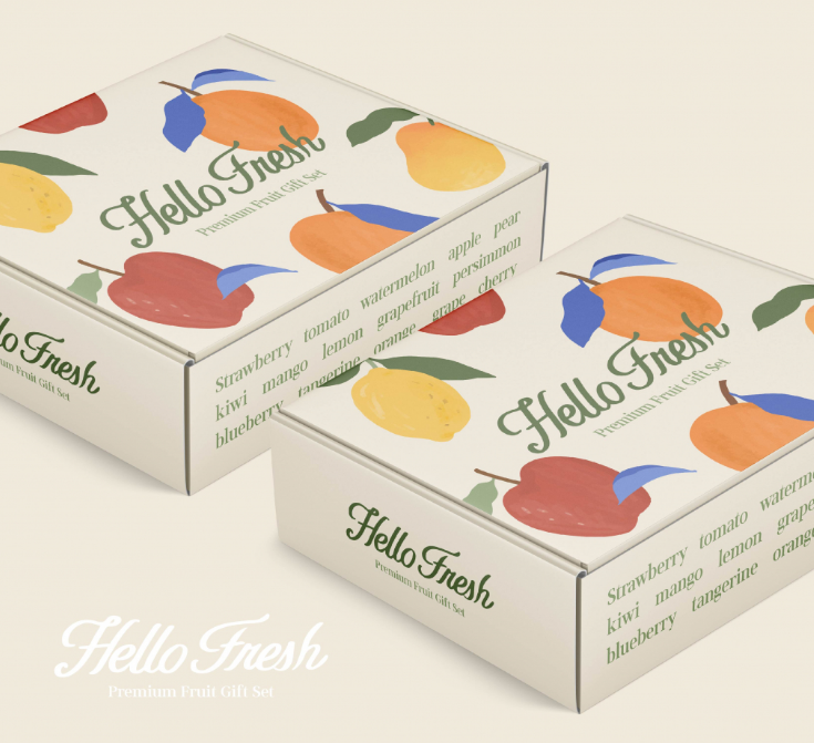 과일 일러스트와 HELLO FRESH 문구를 중심으로 밝고 따뜻한 느낌으로 계획했습니다.